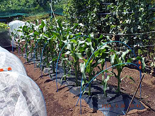 1回目のトウモロコシ  この後2回目を植えて・・・   右のエンドウもあと半月もつかなあ