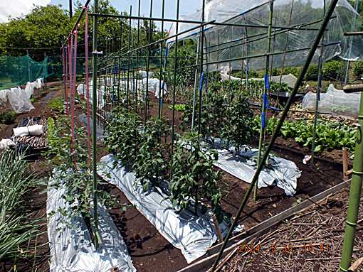 ジャガイモ  この前の雨風ですこし倒れた  周りを囲ってどうにか持ってくれるか 今が大事