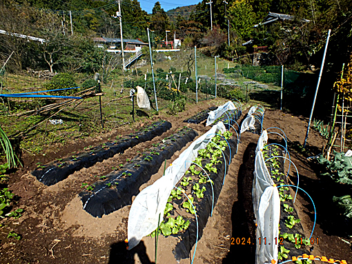 左のマルチはとちおとめ  レタス苗もポットを移植  奥はカリフラワー