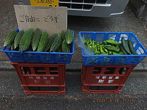 自宅の駐車場で  キュウリ ピーマン シシトウ ゴーヤ  みんな喜んで持って行ってくれる