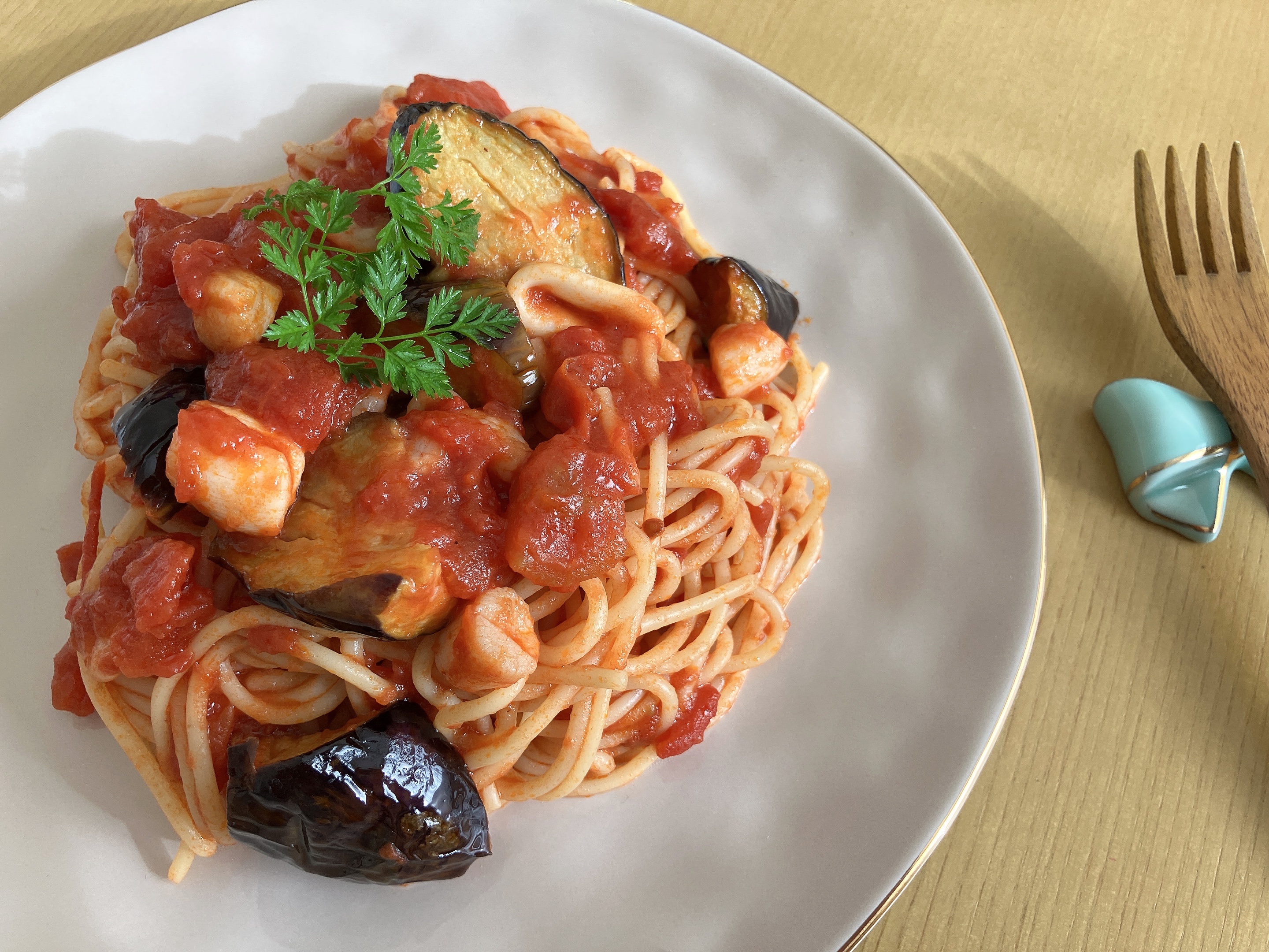 ナスとシーフードのトマトパスタ( "´༥`" )