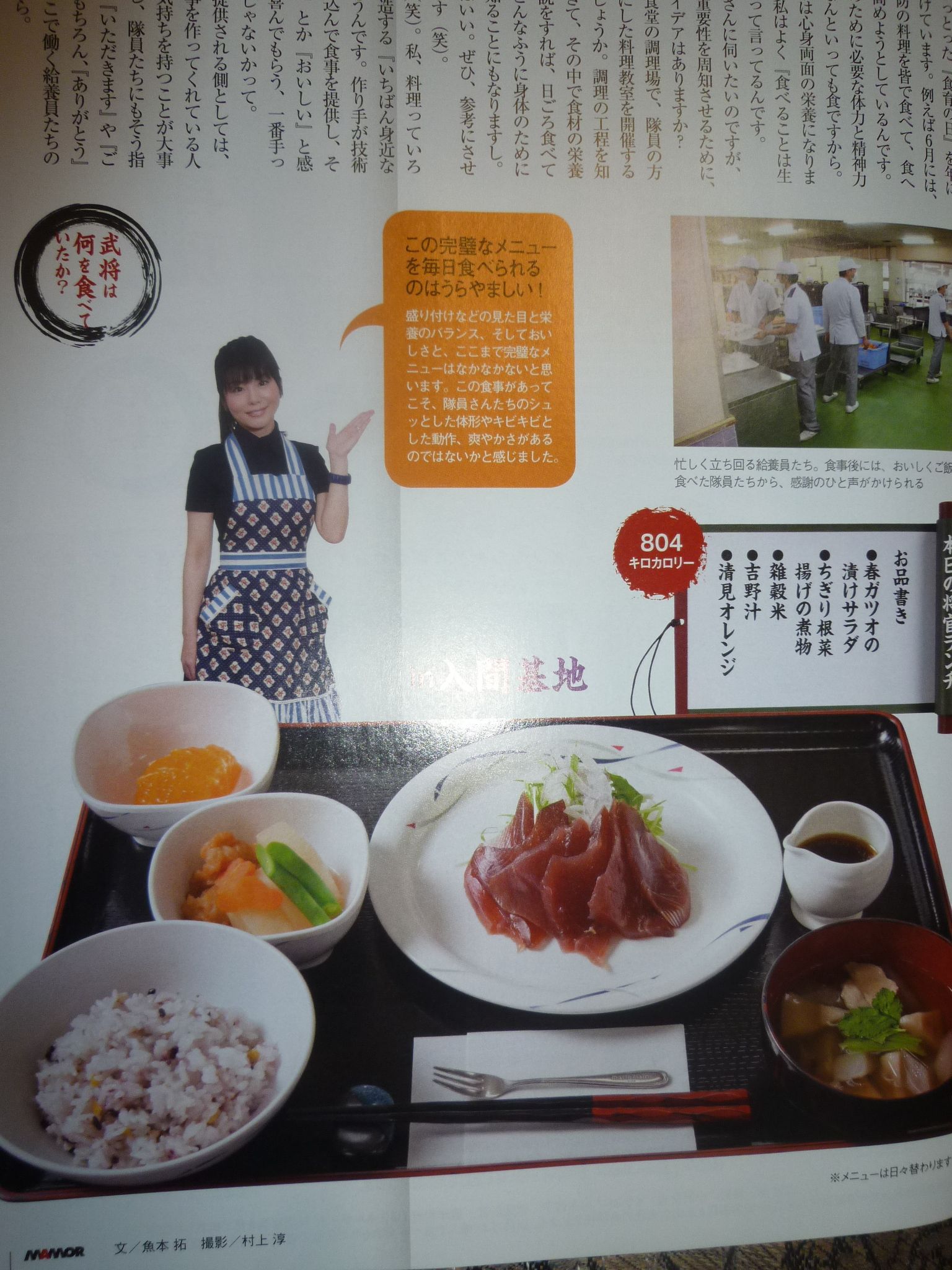 上記は、自衛隊の機関紙「MAMOR」の記事です。基地の隊員が食べているランチの画像です。カツオの漬けが美味しそうです。