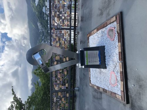 あいじょうモニュメントの前で、愛する人と愛を誓いあいます。後ろにある柵に絵馬に願いを書いて、恋愛成就の祈願をしたり、