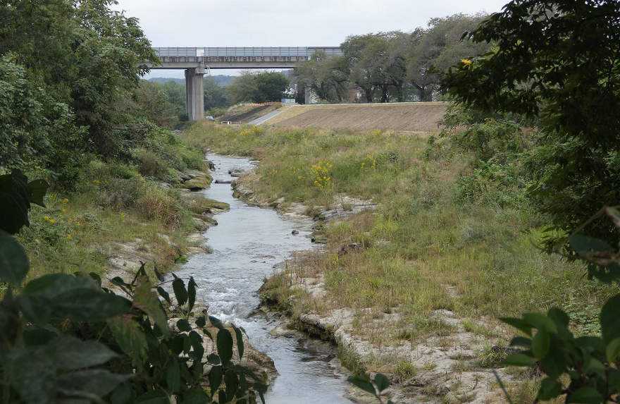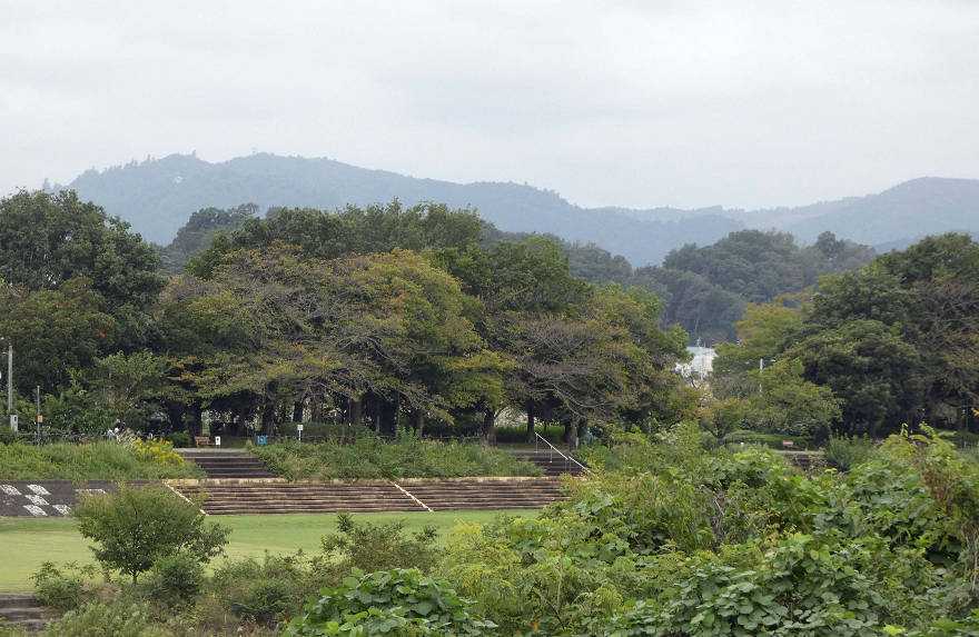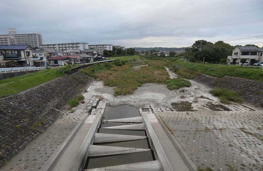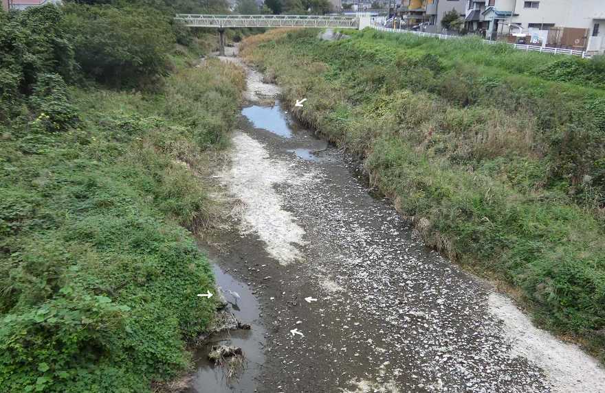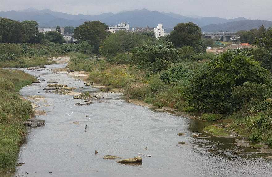 07:23、市役所北側の鶴巻橋の真ん中で浅川上流側を眺める。