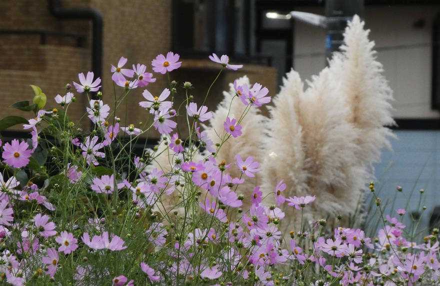 06:32、南浅川を上がってコスモスとパンパスグラス。