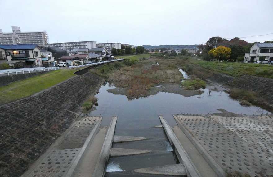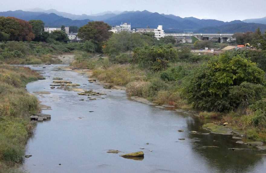 07:13、市役所北側の鶴巻橋の真ん中で浅川上流側を眺める。