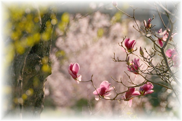 3月18日の午後4時前後に地元の花卉の里山、大阪府東 山麓の神立、大窪地区が麓から桃の花 ピンク色がみえたので車で上がれるとこまで上がって見たら桃や木蓮が咲いてウグイスも鳴いていました、黄砂で霞んでいるのと早くも西日の赤みが混じって色合いを少し修正しました、福島県の花見山は今が満開なので一ヶ月開花は早やかったのです ´▽`*)アハ