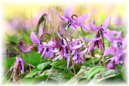 カタクリの花、撮影レンズは500mmで...杭の上に乗せて撮りました、木漏れ日は刻々と変化しますので足でかせぎました カタクリの花上の2カットは写真風と日本画風に仕上げてみましたこんな作品イメージしてプラス補正していましたので日当たりの作品の多くは色を飛ばしてしまいましたし群生していますので作品つくりには這いつくばらないといけない下向きに咲く花はしんどいです...´▽`*)アハ 六甲高山植物園は斜面に咲いていて通路も確保されているので意外とラクチンでした