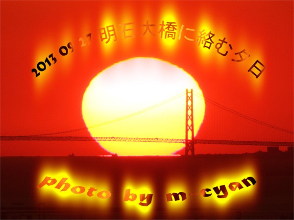 恒例の秋の夕陽ウィーク。9月28日~10月2日の5日間、前後に一年に2度だけ、明石海峡大橋と夕陽が重なり合う雄大な景色を 見ることができたのです...ネット環境がつぶれていましたのて新しくモバイル WiMAXで復活しています...撮影していた画像を順次UPが遅くなりましたが綴ってまいります( ̄▽ ̄)V いえーい! 何度となく撮影に出掛ける暇がありましたので...「好きな者に与えられる」...ナンチャッテ!...今年は良いカットをいただきました\(^O^)/v v