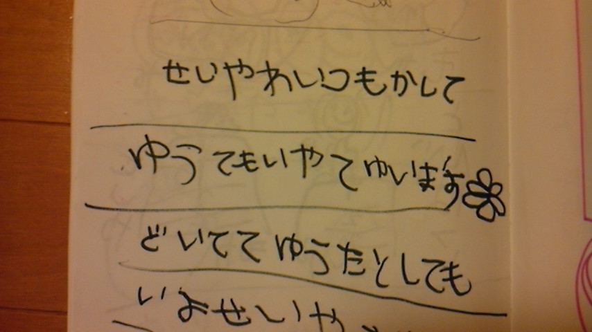 お姉ちゃん、5歳1ヶ月。 上手に字や絵をかくようになりました。 ひらがなを左から右へ上手に横書き。 ノートをのぞいてみると、「せいやわいつもかしてゆうてもいやてゆいます(セイヤはいつも“貸して”って言っても“イヤ”って言います)」と日記のよう。 そして、内容に大笑い! こんなふうに所々間違って書いていることもあるけど、文章が書けるようになったのは大きな成長です。 最近は漢字にも興味を持つようになり、「これ見て!」と見せられた紙には「目」「大」「人」の字が。 いつか見た字を覚えていたようです。 それからアンパンマンの顔も上手くなった! 黙々と机に向かっていることが多く、勉強熱心です。 長いお盆休みが終わり、また保育園の生活。 なかなかお盆休み気分が抜けず、朝スッキリ起きられないし、起きてもボーッとテレビ見ていたりで、準備をしないモカ。 またパパさんがいない生活になった寂しさもあってか、甘えたり、泣き出したりすることも。 気持ちはわかるけどね… 保育園のプールでは、顔を水の中につけたり、浮き棒を持って浮いたり泳いだりしてるそう。 もともと水が苦手なモカ。 特に顔に水がかかるのが嫌なので、ちゃんとできるのか心配してたけど、お友達もいるからがんばってやってるみたい。 家のお風呂でも、「顔つけるから数えて~」と。 最高10秒つけていました。 それを見ていたセイヤは真似して、口をお湯につけて…ん?飲んでないかい? 「出して!」と言ってみれば、案の定、口からダ~ッと吐き出すセイヤ。 セイヤには顔をつけて水を飲んでいるように見えたみたい。 そして、モカは髪の毛を洗う時も私の膝に寝転ぶのではなく、「上からシャワーをかけて~」と。 水を克服できたようなので、スイミング習ってもいいかもね。 プール最終日の昨日、スイミングを習っている年長さんがクロールを披露してくれたって言ってました。 家の小さいお風呂では泳げないので、リビングでセイヤとプールごっこをするモカ。 モカは先生。 「下向いて寝て!」とセイヤをうつぶせに寝かせて、両腕を引っ張って床の上を泳がせています(笑) セイヤは嫌がることなく、されるがまま。 セイヤの次は、ぬいぐるみたち。 おもしろい光景です。 他にもセイヤとごっこ遊びすることが多いです。 ぬいぐるみたちとセイヤをならばせて、モカはみんなの前で絵本を読み聞かせ。 ここでもモカは先生役。 「きょうりゅうとおばけのおうち」とか言って、お話をしています。 「絵本見える?もうちょっとこっち行こか。見える?」と気遣いながら。 洗い物をしながらそんな本ないけどなぁ…と思いつつ、こっそり様子をうかがうと、モカが手にしているのは「恐竜の図鑑」(笑) 図鑑をめくりながら自作のお話をセイヤたちに聞かせていました。 最近、食欲旺盛で大人の量くらい食べます。 ただ、やっぱり家では立ち歩いたり、遊んでしまうことが多くて、食事に時間がかかりすぎます。 メロン、梨、スイカ、ぶどう…セイヤと取り合いするほど大好き。 最近、プリキュアよりキョウリュウジャーが好きなモカ。 お盆休み中に買ったキョウリュウジャーのDVDは何回も再生して踊りを踊ってるし、パパさんが録画してくれたキョウリュウジャーも飽きずに何度も見てます。 ついには「キョウリュウジャーの服がほしい!」と。 私がパソコンでネットショッピングしていると、「キョウリュウジャーの服、買って~!」と。 「え?キョウリュウジャーの服?パジャマじゃなくて?そんなんあるの?」と聞けば、「“キョウリュウジャー 服”って調べたらいいやん!」とビックリ発言。 検索のやり方、知ってるん? 「ね、調べて!」って言うので、“キョウリュウジャー 服”と入力して検索。 見ていたサイトではやっぱり、どか~んとイラストがのったパジャマしかなく。 っていうか、キョウリュウジャーって男の子じゃない?? なのに、モカは「いいの!いいの!」と。 まぁ、そのうち冷めていくと思うけどね。