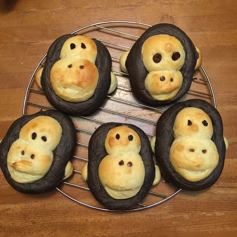 明けましておめでとうございますお天気が良くて暖かいお正月でしたね2016年は申年ということで今年も干支パンを焼いてみましたロールパンの生地に半分ココアを混ぜてお猿さんを作ってみました目にはレーズン、鼻にはチョコチップを使いました成形の時に上下間違えたため耳の位置が下の方になんだかお猿さんに見えませんが 愛嬌タップリでしょう楽しく、美味しく出来ましたよ~今年もよろしくお願いいたします