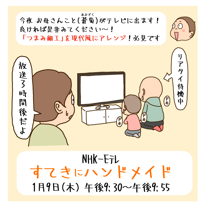 なんと嫁さんが今夜テレビ出演ですちょっとじゃなくて、まるっと30分嫁さんだそうです!ぜひぜひご覧いただけたら嬉しいです!【すてきにハンドメイド】NHK-1月9日(木) 午後9:30〜午後9:55