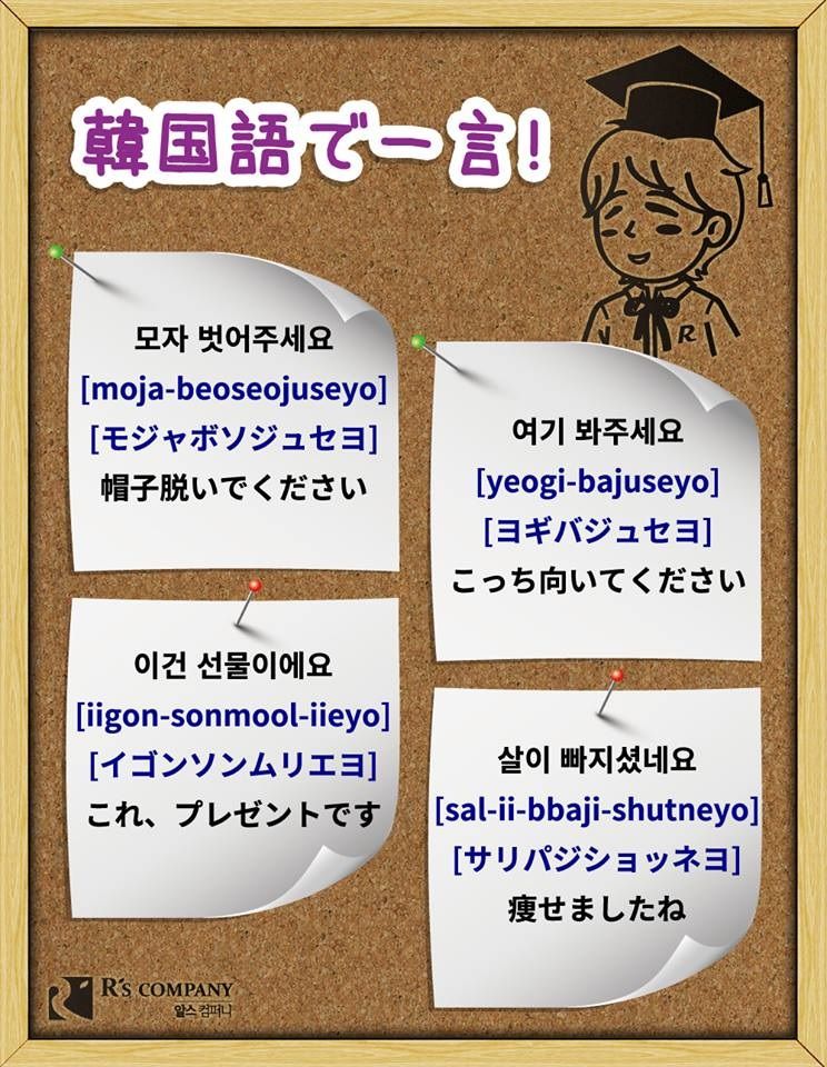 ファンの皆様、アンニョンハセヨ。「韓国語で一言!」の最初の時間です!「韓国語で一言!」の時間では二三節の真似しやすく、シウォンさんにも使える簡単な韓国語の表現を習ってみましょう。^υ^...さあ、それでは早速、始まります!1.모자 벗어주세요[moja-beoseojuseyo]「モジャボソジュセヨ」 「帽子脱いでください」レーシング場の報告会でのシウォンさん!帽子を被っている姿も素敵なんですが、シウォンさんの顔を見たい皆様、どんどん使ってください~2.여기 봐주세요[yeogi-bajuseyo]「ヨギバジュセヨ」 「こっち向いてください」 人が混む場所、レーシング場や、ピートワーク、ファンミーティングのQ&A時間、空港などでシウォンさんと目を会わせたい方にピッタリの表現!3.이건 선물이에요[iigon-sonmool-iieyo]「イゴンソンムリエヨ」 「これ、プレゼントです」 皆様が準備した大事なシウォンさんへのプレゼント!韓国語で言いながら渡してみるのはいかがでしょうか。4. 살이 빠지셨네요[sal-ii-bbaji-shutneyo]「サリパジショッネヨ」 「痩せましたね」 一日一食しかしないシウォンさん!皆様に久しぶりに会う時は必ずダイエットをして格好良く見えるように頑張っていますが、来年、久しぶりに会ったシウォンさんへ一言はいかがですか。面白くて役に立つ表現!その最初の「韓国語一言」コーナーはいかがでしたか。よく覚えて、2017年には使ってみましょう!う~んカタカナだけ読んでも・・ よく分からない映像で、誰かが発音してくれなきゃね~ シウォン君は無理でもスタッフの方とかさ~わがままなアジュマでした~ブログ村参加中応援よろしくね今日もポチっとクリックお願いします♪