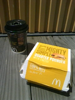 お昼はマックのクォーターパインダーとプレミアムコーヒー。クォーターパインダー、なかなかデリシャスでしたよ。マックにしては少し厚みのあるジューシーなビーフにシャキシャキのオニオン、2個?か3個?のピクルス。たぶん次もこれを食べるだろうな。シンプルなバーガーで私好みです。家に帰る途中、会社の友達とすれ違い。メールしたら、今からジャスコで絶品バーガーを食べるとの事。贅沢にも絶品ベーコンチーズバーガーにしたらしいです。外がぽかぽかで暖かいので玄関前のベンチで食べました。