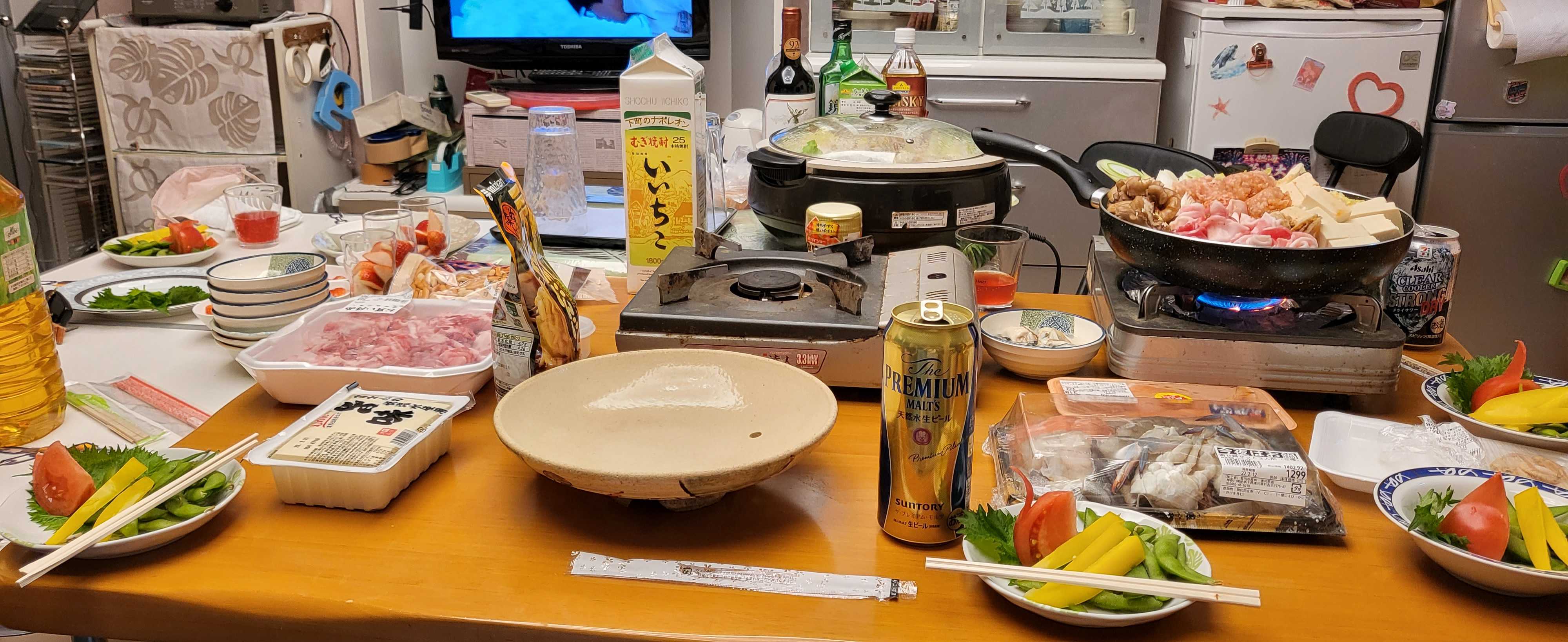 3種類の鍋やその他料理を食べながら買い込んだビールを飲み、盛り上がります。