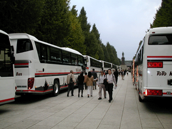 境内には60台位でしょうか大型観光バスがとまっていまして各窓ガラスには全国各地の名前の貼紙が・・。全国から遺族会でも集まっているのでしょうか・・。その割には人がほとんど見当たらない。わずかいる人もどうやら外国からの観光客も多いらしいみたいです。特にハングル語らしい言葉をしゃべる若者が多かったみたい。もっともその方たちは参拝まではしていませんでしたけど。