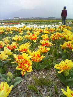 北九州空港をレンタカーで出発し、とりあえず宿舎へ向かう。その途中チューリップ畑がありました。遠賀川という川の河原にたくさんのチューリップが咲いていました。