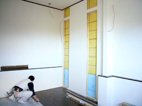 ダブルウーハーズの会長が、建築中の我が家を視察に訪れるらしい。同じく建設中のご自宅の参考にしたいらしい。あのオカネモチの参考になるようなことがあるのかしらん?と思いつつ、2007年一発目の自宅見学に行ってきました。偽石井式壁の吸音開口部のネット作成のために買い求めたジャージークロスも、大工さんに手渡さないといけませんし、タイミング的にはちょうど良いでしょう。 おかげさまで家はほぼ完成。あとは電気工事と二重窓やはめ殺し窓の設置と、オーディオルーム施工のみ、のよう。昨年12月からは、大工さん一人体制になり、意思の疎通もラクチンです。開口部の作り方もステサン片手に口頭伝達。今日もコツコツと(実は年内に終わる予定だった)オーディオルームの床貼りをしてました^^床材は合板なので木目が音に及ぼす影響は少ないと思いつつも、スピーカー設置予定場所に対し、垂直方向に貼ってもらってます。また、クッションゴムのない床材を貼るよう石井式ルームでは推奨していたようにも思いますけど、やはり居住性を重視して、コンクリの上にはベースに薄いゴムが貼られた床板を採用しました。(その手抜きで音がどうなるかは、ホームシアター誌36号P125ページに詳しい)偽石井式壁も吸音開口部のネット取り付けを除いて作業終了している様子。ビニールも剥がされてますね。開口部は素材に無駄のでない幅455mmです。部屋を壁紙で覆ってしまうと、デザイン的にもう少し吸音開口部の面積が大きくてもよかったかなとは思いますね。開口部は床を除く総壁面積の8%しかないですし(ロック向けなら20%は必要と思う)。もっともこの部屋は天井が薄く、反斜面として成立していないかもしれないけどね。 この状態でまたパンパン手を叩いてみました。前回同様定在波がビンビン響く感じはありませんので一安心。会長や大工さんとの会話は聞き取りやすいですが、今はまだ(人の声の)高音部にやや体育館チックなクセがあるかな? ずっと天井の低い和室暮らしなので、生活感のないこのライブな部屋では多少の違和感はあります。機器が入り、ソフトが入り、本が入り、イスが入り、人が入れば、今後それは大きく変化していくことでしょう。 壁は塗りではなく、よくあるビニール壁紙です。少しでも凹凸があった方が反射に有利かと、建設会社の見本にあった200数種類の中から、一番手触りの粗いもの(それでも1.5~2mm凸くらいか?)を選びました。エコブームからか、今でも織物や和紙等音に良さそうな壁紙はありますが、考えてみると部屋の中でも壁の面積は一番大きいわけで、ルームチューンとしてのオーディオ用の壁紙なんて商品があってもよい気はしますね~。厚さ2mmくらいの多孔構造なんて壁紙があったら飛びついたのに^^にしても、白い壁紙を貼ると、ずいぶんと部屋が明るくなりますねぇ ライトや取り付けはこれから。とはいえ、1W以内に完成してしまうでしょう。 会長はここを見て、どう思ったことか・・・ 会長新居は実は徒歩圏内。超ご近所さんです。建設中のその大邸宅に場所を移して見ましょうか。 うげげげげげっげ! 会長のBlogを見てもおわかりの通り、そして既に本Blogでも報告させていただいた通り、広いわ。。。広すぎるわ。。。 「この部屋は何だっけ?」なんつう“依頼者なのに把握してないのかよ!”と突っ込みたくなるご発言から、「オーディオ来客者用トイレ」という初めて聞く日本語まで、桁違いのスケールです。ため息しか出ませんなぁ。ハハ。一体我が家が何の参考になったんだか(爆 オーディオルームは30畳以上。2×6工法で、高天井の部屋が出来上がるようです。今は基礎だけ。家そのものが広すぎて一度には出来上がらないらしく、居住スペースと少し離れたオーディオルームは今年春に完成予定だとか。来客の多い会長宅。その帰りに「ついでにO崎んちでも」みたいに流れてくるんだろうな~。やだな~これ絶対比較されるんだろうな~