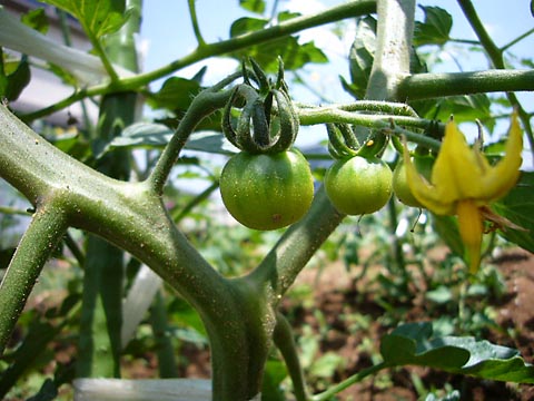 まだ5月中旬なのに夜中に蚊がブンブン。うるさくて眠れやしません。それでなくとも、睡眠時間が短いのに・・・。前のアパートは5階だったから虫はおらず、その点では快適でした。もっとも家庭菜園の受粉も失敗しましたが 花の咲いていたミニトマトが実をつけ始めたようです。(さすがに受粉はしていたらしい)よかった! だって、両隣駐車場の我が家は、特定多数の面々が行き来しており、興味津々で庭を覗いていく人もいるんだそうで。これで何も実らなかったら恥ずかしいな、スーパーでトマトでもナスでも買ってくくりつけるか、と話していたところ(爆今年の夏の主食はトマトの予定ちょうど水はけの悪そうな粘土層を開墾した上に、ミニトマトもナスも植えてしまったようです。時々の雨に畝間の乾きが遅いことしばし。これから降るであろう大雨に備えが必要かもしれません。そうそう、育ちの悪いナス(とはいえ、10本植えて、1個実を付けた↓)とキュウリに追肥しました。これでまたしばらくは静観でしょうか。