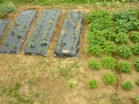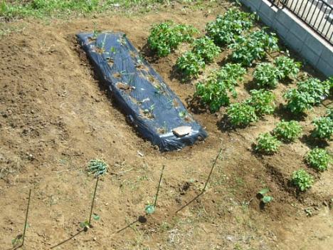 5月に入ってからなかなか太陽に恵まれず、肌寒い日も続いてます。今日は最高14度ですから、3月末の気温です。園芸店でも苗の種類がだんだん増えてきましたから、もう少し待ってから(地温が上がってから)植え付けた方がよいのでしょうが、なにせ週末菜園です。手の空いたときに行わねばなりません。特に肉体労働は。草をむしり、ナス用のマルチシートを敷きました。植えたのは黒陽、千両二号 4本ずつです。豊富な水が必要なナスにシートが有効なのかどうかはわかりませんが、少なくとも雑草には有効でしょう。去年はずいぶん雑草に悩まされたからなぁ。昨年に比べてずいぶんと苗間を取ってみました。ナスも(予想より)大きくなることがわかりましたから。シートの右側はジャガイモ(男爵&メイクイーン)です。ずいぶん大きくなったでしょ。手前側の苗が小さいのは錯覚ではありません。手前は今年開墾したところ、つまりは耕し不足、肥料不足なんでしょう。土は正直ですね。
