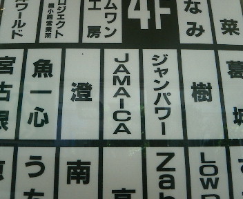 この時期あそこに行って、この写真1枚しか撮ってこないとはいかがなものか^^;少し前、6月のさわやかな風が吹くあそこに、3日ほどおりました。先々週はあそこで、先週はあそこで、今週はあそこ、次週はあそことあそことあそこです。なんと慌ただしいこと。日本も世界も狭くなりましたな。あそこへ行けば定番のあそこの、雑居ビルの店名一覧が上記写真なわけですよ。エレベーターで4Fに上がり、思い扉を開くと、そこには変わらぬ雰囲気が、JAZZが流れていました。私は日中は窓明かりのあるカウンターに腰をおろします。それ以外の席は薄暗く、本を読むには不向きだからです。振り向けばJBL パラゴン、見上げればオーディオ機器という格好の席。あれ? アンプはあんなに新しいレビンソンだったっけ?3日間あそこにいても、駅を中心に半径3km内をうろちょろしていただけ。パラゴンを背にしていた時間が一番長かったかもね^^いつ来てもいいところだ、「ジャマイカ」