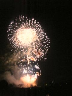 大雨で1週間延期となった花火競技会、昨日はお天気にも恵まれ風もそうは吹かずで良い条件でした。昨年は風下となり灰や燃えカスが沢山落ちてきました。姉夫婦も来れて打ち上げる元の所から見えるダイナミックな花火を6時から8時半まで楽しみました。 75回目の大会だそうです。スターマイン(速射連発)22個、10号玉45個、創造花火22個の3部門です。番号は93まであるのにそれぞれ足すと89・・・??でプログラムを良く見ると4、42、44、49の番号が抜けています。危険な仕事だけにゲンを担ぐのですね!余興花火が6ありましたがコレでも350発。10号玉は文字通り一発勝負!ですが創造花火は何発も上げてよいものが採点されるようです。スターマインときたら曲つきで視界一杯に次々と数え切れないほどのものが打ちあがりもったいないような気さえしました。スターマイン「ベルサイユのバラ」はあの宝塚の歌つきの曲!それはそれは華やかでした~10号玉5発、創造花火2発、スターマイン2発などの順番で打ち上げられるので、スターマインの豪華絢爛な後の10号玉は凄く豪華でも寂しく感じてしまいます。ここで花火のウンチクを花火の種類は昼物と夜物とがあり昼物は煙の色を夜物は光の彩りを見る。打ち上げ花火は大別して釣物と割物とがある。釣物ー落下傘などにより中空に月、星、連星、竜などを吊ってみせる。(土浦の打上現場の近くに高圧電線があるため禁止されている。)割物ー菊、牡丹、満星、変化菊、芯菊などがある。玉のサイズはたとえば10号玉ー玉の直径28cm玉の重量8kg打ち上げ筒の太さちょっけい30cm 開発高度400m開く直径300m5号玉ー玉の直径14.2cm重量1.1kg筒の太さ15cm 開発高度200m開く直径150m座りー打ち上げられて最高点で開くのが最も良い。玉が上昇から下降に変わる瞬間で星が上下方向に流されること無く花火が丸くなる盆(ぼん)ー花火の開いた形を盆という。大きく真円なのが良い抜け星(ぬけぼし)ー星が予定外のところに飛んだり点火されなかったりして、あるべきところが抜けてしまうことをいう。またふらふら泳ぐ星を「星が泳ぐ」という。消え口(きえくち)ー花火はすべての星が同時に色を変え、同時に燃え尽きるのが理想的。花火の燃え尽きるときを消え口という。すべての星の消え口が揃うことがその花火の印象を引き締める。八重芯ー丸く開いた花火(親星)の中に二重の芯がある三重の花火。三重芯は芯が三重ある四重の花火で四重芯は五重になる。今日ホームページで見るとスターマインは茨城、山崎煙火製造所の「JAPAN BLUE」がトップでした。荒川静香選手が滑ったあの曲です。色や形、音楽に合っているかも採点されます。創造花火は秋田、北日本花火興業で「ヒヨコの可愛いあんよ」、最後に2本のヒヨコの足がぱっと出て可愛かった!10号玉は綺麗に広がるかいっせいにぱっと消えるかなどが大事でまず始めに「審査標準玉」昇曲導付八重芯変化菊が一発上がります。コレは85点と発表されました。競技が始まるとみんなてんでに点数をつけて「ん~コレは75点だ」なんて盛り上がります。昇(曲付、曲導付)(のぼり)ー玉が上昇する間の変化をいう。太い尾を引くものを「曲付」、小さな変化を次々に開かせるのを「小花」左右に葉が開くものを「木の葉」太い白銀色の尾を引いて上るものを「銀竜」と呼ぶ始めのころは炸裂する花火につい爆撃を連想して平和な国で花火を楽しむ人間がいる一方で辛い思いをしている人たちがいるんだな~などと考えてしまいましたが、美しさや迫力に見とれているうち、今に皆がこんな風に花火を楽しめるといいな~と思ったことでした。去年は夢中になって写真を取りましたが、かや母には技量もなく今年は写真なしで存分に楽しみました。かや2娘の写真を1枚もらって記録。今年は滝のように流れ落ちるもので細い光の束がふわ~っと長く落ちるものと、薄い上品な紫の光が綺麗でした。帰りは駐車場まで遠くって姉上、兄上申し訳ありませんでした!手違いも数々・・・コレに懲りずまたかや家のイベントにおいでくださいね~。