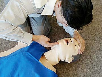 ゴルフのトピとは全く関係ない話題です。今日は終日会社の安全運転管理者として年に1回の指定講習でした。「今年はいつもより時間が長いナァ」と内容を見たら消防のレスキューの方が来て心肺停止の蘇生の訓練も行うとのことでした。近所は年寄りばかりで去年は2度ほど近所のお年寄りを助け、119番通報も行いました。なにより私の父はペースメーカーを入れてますので、やっておくに越したことはないと思って実技体験に手を挙げてチャレンジしました。こんな感じでした。ここでKISSです(正確にはマウス・トゥ・マウス)う~でもゴム製の人形のマスク、しかも男顔、結構リアルで死んだ人みたいで気持悪かったです。他にAEDという多くの人が集まるところに設置されている心房細動から復帰させる電気ショックの使い方も教わってきました。これで私がいるときはNIMAさんも安心できます^^v