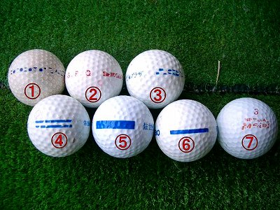 私が行くトコにはこのくらいの種類のボールが混じってます。節約してるな~。飛ばない順に番号ふってます。ドライバーで打つのは5~7、あとは3番アイアンのハーフショットとSWのアプローチで打ちます。皆さんのトコはどんなカンジでしょうか?