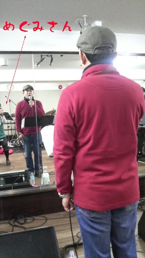 麻丘めぐみさんのコンサートのリハに行ってきましたよ。梅ガ丘駅周辺には駐輪場がないので電車で。リハーサルスタジオは駅のすぐ前でした。すでにリハーサルは始まっていて、着くとすぐに僕の唄う曲のリハです。ソロで唄う曲からリハーサルしたんですが、いいですねぇ、生バンドで唄うのは。みんなと唄う3曲もめっちゃ楽しく唄えました。全体練習にも参加して、またまた気持ちよく熱唱。熱唱振りを鏡越しに、めぐみさんに撮ってもらいました。ちょこっとめぐみさんが写りこんでますね。終わって同じビルの地下にある居酒屋さんへ。楽しい時間を過ごせました。バンドの皆さんも歳が近いので、話が盛り上がります。ベースの藤田さんに、色々とお話を伺い、参考になりました。そんな楽しい時間なんですが、どうも喉がねぇ。今朝くらいからなんだか咳が出てます。まずいです。生姜入りコーラをポットに入れ、ちびちびやってたんですけど・・・。声だけは枯れないでほしいなぁ。