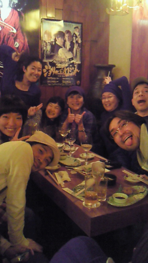 10時15分にロビー集合。これは僕じゃなく四国へ移動するメンバーのこと。僕はもう少しゆっくりできたんですが、ホテルの玄関でお見送りを。ジャンボタクシーで博多駅へと旅立っていきました。その後、僕は地下鉄で福岡空港へ。ん??博多までタクシーで行ってもよかったかな・・・。家に帰って荷物を置きホッとして、新宿紀伊国屋ホールへ。ラッパ屋第34回公演「ブラジル」を観てきました。いい大人たちの可笑しくも考えさせられ、でも笑ってしまうお話でした。ラッパ屋は面白いなぁ。実は、昨年上演した「思い出トランプ」のメンバーで飲み会の話がありまして、今日観にいくメンバーが多かったので、観劇後に飲み会ということに。ラッパ屋の飲み会と同じ場所でもうごっちゃになっての飲み会でした。「思い出トランプ」は根岸さん、阿知波さん、宮地さん、田村くん、野本くん、富田さん、和田さん、愛ちゃん、当然のことながら、ラッパ屋の弘中さん。他にもたくさん知ってる人がいましたよ。本公演の演助をやってくれた江原ちゃんもいました。以前ドラマでご一緒した相島さんにも久しぶりに会えました。春風亭昇太師匠、柳家喬太郎師匠も。楽しい芝居を見たあとの飲み会は、楽しさ倍増ですね。和田さんが撮った写真をもらいました。麗奈ちゃんが来られなかったのが残念でしたね。それにしても楽しそうだ。