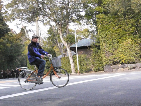 夜11時半に出発した夜行バスは、途中2回の休憩をした後、朝6時に京都駅八条口に到着。コンビニでアンパンと水を買い、6時43ふん発の近鉄線で伊勢へ。今回はスローな旅をしたいので、快速や急行で移動です。大和八木で乗り換え、9時半に伊勢市駅到着。伊勢詣りをしようと思いまして、どうせなら外宮、内宮と回りたいですよね。そこでレンタサイクルを借りました。まずは外宮へ。あまり人もいずのんびりと歩けました。レンタサイクルのおじさんに教えてもらった道筋を通り、倭姫宮にも寄り、内宮へ。すごくいい天気で自転車で走るのがホント気持ちよかったなぁ。内宮へ通じるおはらい町は混んでました。宇治橋は工事中で隣にかけられた仮設の橋を渡り、大勢の人とともに歩いていきました。途中の五十鈴川御手洗場の水のきれいさに感動。谷本知美ちゃんの歌「五十鈴川」はここだったんですね。歩みを進め、御正宮へ。ここでも多くの人が階段を上ってましたが、「写真は石段下で」と看板が各所に掲げられてるのにも拘らず、あちらこちらで写真を撮ってる姿は、ちょっと残念でしたね。御正宮から戻る途中でパラパラと雨が降り出しました。急にザーッと降る感じではないんですが、自転車移動としてはいやな雨です。早く戻らなければという思いの他に、伊勢うどんを食べなければという思いが!おかげ横丁のうどん屋さんで食べようと思ったのですが、これがものすごいお客さんの数。待ってたら、雨足も強くなるかもしれないし、電車の時間もあるので、断念。駅を目指して自転車激走です。スローな旅がテーマだったのに、急にハイテンポになっちゃいましたね。何とか途中の食堂で、伊勢うどんを食べることができました。さすが地元!!と言いたいところですが、いつも行ってる高田馬場の一歩のほうが美味しいような・・・。まぁ、こればかりは好みですからね。自転車を返し、赤福を劇団用お土産として買い、予定の電車にも間に合いました。帰りは、丹波橋で京阪電車の乗り換え、四条まで。ホテルにチェックインして、京都会館へ。旅のメンバーはみんな元気でした。B作さんに、しょうもない還暦の祝いを渡し、みんなと談笑してると、角野卓造さんがいらっしゃいました。ちょうど京都で用事があるとかで、還暦祝いにわざわざ来てくださったんですね。ホント、角野さんとB作さんは仲がいいんですねぇ。で、今日は芝居は観ずに、ライブハウスへ。僕の好きなギタリストの丸山ももたろうさんが河原町三条のライブハウス「和音堂」にゲストで出るというじゃありませんか。雨の中、徒歩で移動。今日はどれだけ歩いてるんだろうか。ちょっと足がだるくなって来てます。自転車激走の影響もあるでしょうね。ライブは楽しかったですよ~。 「三井ぱんと大村はん」というデュオ。ブルースが主体なんでしょうけど、MCも面白いし、歌も楽しいし、最高でした。ブルースってカッコいいですね。ベースで弾けたらいいなぁ。丸山さんはいつも、「ももかん」として見てるのでソロでのライブは初めて見ました。ギターの巧さはいつも通り、さすがでしたし、地元に戻ってのライブでしゃべりも絶好調でした。いやぁ、濃い一日だったなぁ。おなじみセルフタイマーでの一枚、外宮近辺。