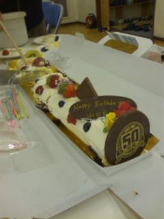 コメントありがとうございました。誕生日を無事迎えることが出来ました。あ、風邪気味だからそれほど無事って事もないか・・・。ま、大きな病気とか事故もなく一年過ごせたことに感謝ですね。55歳・・・大人な響きだ。僕が子供の頃なら、定年退職の年だ。定年がある仕事じゃないけど、そのかわり明日どうなるか分からないしなぁ。もっとも今のご時世だと、大手に勤めてても明日どうなるかは分からないですよね。稽古場を大崎に変えての稽古でした。スタジオを借りてそこに簡単なセットを組んで実寸での稽古です。階段が簡単とはいえ階段なので、動きが微妙に変わります。転換の段取りも取りましたが、道具が多いので大変です。って、僕はほとんど転換は参加してないんですけどね。稽古終わりで、バースデーケーキをいただきました。劇団に入って31年、本公演でお祝いをしてもらうのは初めてです。いつも春にお芝居してないし、地方公演のときは僕が参加してないし。トレインを模したロールケーキでした。男の子のバースデーケーキに最適ではないでしょうか。味も美味しいケーキでしたよ。初日まであと1週間、風も早く治さねば・・・。55歳のこの一年も、楽しく色んな事ができればいいなぁ。