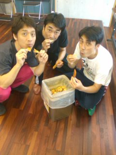 雨の中、お越しいただきました皆様ありがとうございました。公演中ですが、いつもの理髪店で髪を少し切ってきました。くせっ毛なので、伸びすぎると変なところが跳ねちゃったりするんです。地球丸ごといただき団の時の髪型が昨日までと変わりました。といっても、整髪してるかしてないかの差なんですけどね。大森は、次の舞台の稽古をしてからスズナリに来ました。舞台上ではいつものように飛び跳ねてましたがさすがに楽屋に戻ってくると、疲れてました。村田は、もともと腰を痛めてるんですが、電気針治療をしてきたようです。若くないですからねぇ、みんな。もちろん舞台に出れば、そんなこと言ってる暇はありません。ただ、疲れが取れにくい年齢になってますね。残り3ステージ、明日は2回公演。最後まで、気を緩めることなく、スパートスパート!!