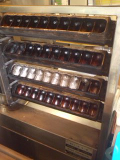 今日は山形市内の七日町近辺を街なか散歩。いつも泊ってるホテルの近くなんですが、夜に到着するのであまり周囲を知らないんですね。山形まなび館は、小学校の旧校舎を利用した施設。展示物が数多くあり、カフェもあってちょっと休憩するのにもいい場所ですね。やまべ牛乳、美味しかったです。coco夢やでは、山形のソウルフード「どんどん焼き」を初体験。箸に巻きつけてあるお好み焼きって言えばいいかなぁ。ソースがたっぷりかかっていて、これまた、んめぇ~。これは、自動タコ焼き器っていえばいいのか?分かりづらいでしょうが、ぶらぶらと揺れてふわふわのタコ焼きができるようです。ん~~、説明しづらい・・・。ビル群の中に突然とある、御殿堰。街なかに、突然現れる水路が涼しげでいいです。抹茶ソフトクリームと、ほうじ茶ソフトクリームを食べました。どちらも、んめぇ~~~~なぁ。デザイナーの奥山さんのお店にも立ち寄り、機能性とデザインに優れた椅子に感動!そして紅の蔵では、この季節ならではの、美味しいおそばと冷製パスタをいただきました。どちらも夏野菜を使って、涼しげで、これまた、んめぇ~~~!その紅の蔵で見つけた面白いもの。なんだかわかります?食品サンプル?うむうむ、そんなふうに見えますね。僕も最初はそう思いました。少しアップになりましたが、これでもわかりませんね。実は、ろうそくなんですね。えぇっ、じゃぁ食品サンプルなんじゃないの?否!これはご供養に使うろうそくです。お墓参りの時、お酒が好きだった故人のためにワンカップをお供えしたりするでしょ。これは、その個人の好きだったものと、ろうそくが一緒になったものなのね。だから、食品サンプルにはない、芯がちゃんとついてます。なんかここまでリアルに作ってあると、火をともすのがもったいないくらいです。面白いもの作るなぁ。