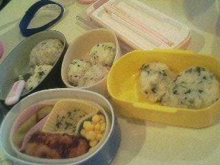 昨日も今日もお弁当を持ってプチお出かけ♪昨日は午前中は消防点検があったのでひたすら部屋を片付けて・・・のつもりが、片付け始めに係りの方がお見えになって、玉砕しました(笑)でもそろそろ片付けたかったのでそのまま掃除をしてからお弁当を作りました。用意が出来たのは12時半。それから支度をして13時頃に出発この日は6月に開催されるフォーラムの打ち合わせ。14時からなので、親子3人でお弁当を食べて私は打ち合わせへ、モンキーシスターズは目の前の水上アスレチックのある公園へ。画像はこの日のお弁当。おにぎりは全てシスターズが握ってくれました。これが結構ラクチンご飯をボールによそって、渡しておけば2人で勝手に握ってくれるのでその間におかずを作っておけば、おにぎりが終わった頃にお弁当箱に詰めるのも自分達で出来るので楽しいみたい。今度は余裕を持って、おかず作りにも挑戦して欲しいなぁ~今日もおにぎり隊はがんばってくれました。お天気の良い外でのお弁当は美味しいですねこの健康的な週末を続けていけたらなぁ~と思いました