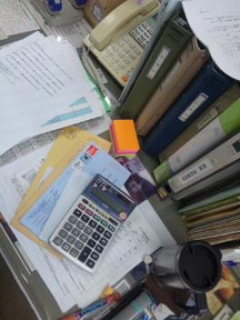 本日、職場でのワタシの机の様子。 順を追って説明しますと・・・1 本日中に処理しなければいけない、取引先さまからの書類2 明日中に渡さなければいけない、取引銀行からの書類3 本日届いた 郵便物4 とりあえずで 見ないことにしてる、、 けど必ず処理しなくてはいけない書類・・・ 確実にヤヴァいのは 4が増えていることかな(汗汗写真には載っていませんが 机の左下にも、片づけなければいけない図面ファイルってのが5冊ほどあったりして。。。(汗汗汗 あぁぁぁ お仕事強化週間の今週だけじゃ終わらないわっ! どうしましょぉ!!! ま、あせらずお仕事するでしゅよ。 明日からまた、 一つずつ片付けるとしましょうか。。。(ため息~~