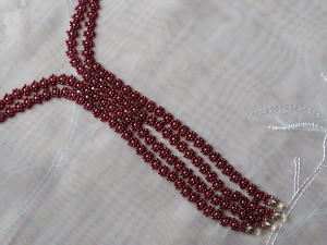 最近お天気が定まらずお洗濯物は深夜洗濯、深夜乾燥の日々家族が出払った後は・・・寒くて外出もしたくないし~またまた 針と糸遊び!!今回は知人の奥様に・・・ご主人には何時も色紙に季節折々の作品を書いて頂いておりますのでお礼にと思いましてドロップビーズネックレスを編んでみました。何時ものbik○uショップのキットですが年齢的に考えてドロップの大きさを少し小さめにしてドロップの色も手持ちの物に変更してみました。材料はドロップビーズ、オクタゴナル、粒小トライアングルA、B、マルテンでした。