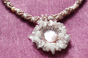 今日は朝から変なお天気!お洗濯物を干したのは良いが。。。お洗濯物がひゃ~洗い直し!!洗濯機を回しながら・・ビーズタイム今日も針と糸のオフルームでピンクシェルペンダントの仕上げを色んなステッチの勉強ですがどの作品も「難しい」の一言です。トップ部分です。フラットオーパルをデリカと粒小で包みサザレと粒小で飾りをつけに成っていました。全体です。ネック部分はスパイラルステッチで同色の丸珠4ミリで繋ぎのアクセントに成っていました。
