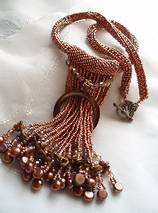 オフルームキットでポリゴンウィーブネックレスを完成!!何時ものbik○uさんのオフルーム今回はブリックステッチでリング編みをうぅ~ん、なかなか手の込んだステッチでしかし・・取り掛かった以上完成させないと納得行かない・・・まぁ~何とかなるでしょうと○十歳の手習い時間は十分あるような無いような家事の雑用をこなしながらの独学手習い ^^;ラッキーかんせい~~♪クリアーできました。^^トップ部分です全体はこんな感じに仕上がりました