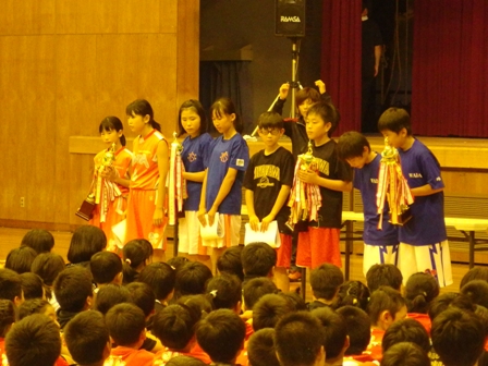 A’sは 9月6日(日) 鹿児島県南部地区大会に 参加しました。えっ~ なんで 第一シードなのMBC大会の敗戦を糧に大会に臨みました。 男子 2回戦 VS K辺ミニ1Q 24-22Q 8-113Q 6-74Q 16-8TO 54-27 WIN たける 4点、こうすけ 16点、こうき 10点、ジョビ 18点、竜世 2点 準決勝 VS ☆峯H ミニ1Q 4-102Q 0-103Q 4-204Q 9-12TO 17-52 LOSSこうすけ 9点、こうき 2点、ジョビ 6点、 チームファール0回 2試合ともに 負けプランでの構成になっています。組み合わせにめぐまれて 3位入賞となりましたが、実力的には 5番手、6番手でしょうか・・・。 勝ちプランで ゲームが運べるようになるのが 次の目標になりますね♪ 女子 2回戦 VS T波 ミニ1Q 5-82Q 4-13Q 12-04Q 2-9TO 23-18 WINてぃな 10点、みこな 5点、なつき 2点、 りお 6点 ともあれ、A’sの 女子チーム 今季の初勝利です。 おめでとう♪ 準決勝 VS 東T山 ミニ1Q 4-18 2Q 6-173Q 2-144Q 2-8TO 14-57 LOSSちより 6点、えり 4点、なつき 4点 こちらも 組み合わせに恵まれての 3位入賞となりました。6年生のいないチームに勝利となりましたが、覚醒のきっかけになってもらいたいですね♪ 人気ブログランキングに 参加してみました。こちら を クリックしてみてね(^∀^)