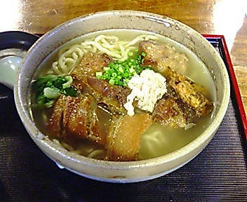 画像は今日の昼飯です。ソーキと三枚肉が両方入ったそばです。