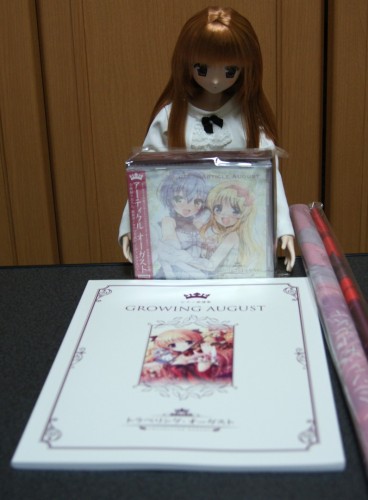 今回は先日購入のオーガスト通販であります実は13日に届いていた…家のものが受け取ったまま気がついてなかったなのですよトラベリングオーガスト関連で今回購入はサイコネ通販とオーガスト公式の2口なんですね前回はサイコネ通販だったので今回はオーガスト公式のコミケにあわせた通販なのであります(陽菜ちゃん)まず届いた箱の開封だよ。(陽菜ちゃん)あれ?大図書館の羊飼いのリーフレットが一番上に…宣伝からかな…((((((^_^;)(陽菜ちゃん)それじゃ、箱の中を出してみるね(陽菜ちゃん)まず『歴代ボーカル ピアノアレンジ集 SPROUT AUGUST』オーガスト歴代ボーカル曲のCDだよ。(陽菜ちゃん)それと会場で買えなかったらと買っておいた 『トラベリングオーガスト コンサートパンフレット』ね♪(陽菜ちゃん)最後に『トラベリング・オーガスト 限定Tシャツ A(赤)』の3つなんだよ。(陽菜ちゃん)それじゃ~ここからは今回のトラベリング・オーガスト コレクション関連ね(陽菜ちゃん)まずサイコネ通販で購入して紹介のなかったタペストリーから(陽菜ちゃん)私じゃなくて白崎さんなのが…かな? 千堂さんやフィーナさんとティアさんはSDキャラで描かれてるんだよ(陽菜ちゃん)絵柄はなかなかお気に入りなんだけど…どうかな?(陽菜ちゃん)今回購入物を並べてみたよ(はるなちゃん)パンフレットが2冊あるのは…だね(陽菜ちゃん)でも買えなかったら悲しいし…良いよね(はるなちゃん)意外と豪華な感じなのも、買ってよかったよね(陽菜ちゃん)結局Tシャツは2種類買ったよね。(はるなちゃん)サイコネ通販は我慢したのにね(陽菜ちゃん)コンサート会場で黄色買ってオーガスト公式で赤だもんね(はるなちゃん)それなら最初からサイコネで2種類買えば良かったんじゃないかなぁ(陽菜ちゃん)そうだよね。(陽菜ちゃん)後はタペストリーと楽譜だよね、タペストリーは上で言ったけど…(はるなちゃん)楽譜は埃かぶったキーボード 早く使おうね…かな?(陽菜ちゃん)バイオリンでも良いんだよ?アレンジしないと駄目なのもあるかもしれないんだけど…(陽菜ちゃん)最後は2種類のCDね(はるなちゃん)このCDのBOXはピアノコレクションとレコーディングアルバムセットで入れるためのBOXだよね(陽菜ちゃん)アレンジCDは何度も聴いたけど良いよね(はるなちゃん)まだ聴いたことのない人は一般販売もあるから是非聞いて欲しいかな?(陽菜ちゃん)ピアノCDはまだなんだよね(はるなちゃん)ゆっくりできる日に今度開封しようかな?(陽菜ちゃん)落ち着いて最初は聴きたいからね結局コンサート関連物は紙袋含めて全部買ったような気が…10th記念CD等については購入済みだからなぁ…ちょっと使いすぎたかな?