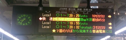19時過ぎに起きた塚本駅にての処理終わりJR再開からしばらくしてから大阪駅へ戻りです再開暫く時間開けたら人少なくなるからそれを見越して駅にて到着電車は45分遅れで45分だと多ければ再開して8本をぐらい?快速&新快速はいったかなと?そして予想通り車内はガラガラ数分間おきに連続で走ればそうなるよねっと(^_^;)aそしてさらにこっちの復旧おわれば大阪環状線が停止とか今日の鉄道網はぐだぐだだなあ