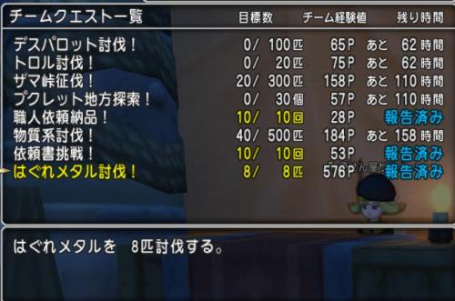 今回チームクエで、はぐれメタル8匹討伐・・・そこではぐメタコインにて迷宮へ…写真はクリア後だけど…はぐれメタルなのでポイント576P(゜-゜)無事迷宮の隠し部屋へなんと、はぐれメタル4匹登場!元気だま使用 4匹討伐なので経験89400ptにてLVUP!無事チームクエも1発クリア…これだとはぐメタコインも価値あるかな…そしてボスはというと今回レアボスれんごく天馬((*`・ω・´*))写真撮り忘れの為に図鑑から拝借そして倒すとグリーンオーブが今回 キャラあいしやさん参加の為多段武器もスキルも無い為にはやぶさの剣を錬金するとまぁ…呪文発動速度 封印 呪文暴走 上級は失敗と2本連続錬金で大失敗!3本目も会心中級失敗、開き直って初級成功X2と…2アカプレイなのでオーブ2個出たこともあって少しはギルも取り戻せたかなぁ…(´・ω・`)