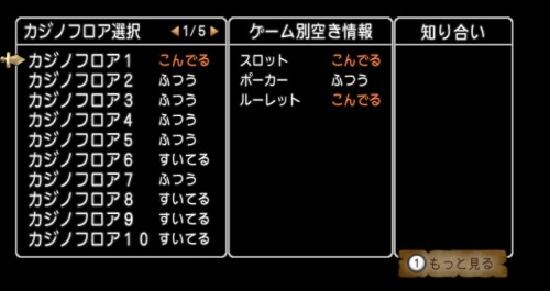 今回のDQX 追加ディスクの目玉?カジノをしてみたまずはサーバ選びから。。。1鯖は混んでる・・ここは通常エリアと同じく(カジノはテンション関係からすいてるはだめぽい?)まずはコインを…とりあえず300枚ほど…さて カジノエリアへ正面にキングスライムが…とりあえず空いてるスロット台へポーカーはがら空き…とりあえずスロットまわしてみた最初に揃ったはぐれメタルが揃うと…ここが勝負どころ?もらえるコインが2倍に77777はジャックポッドぽい・・・ありきたりなスライムが揃ってメタル効果で2倍に近くで大当たりが出ると1回だけテンションアップにて1.5倍に((*`・ω・´*))ここがすいてるサーバーだと欠点に・・・他にもフリースピンというのはコインなしで回せるようです何も考えずに回すとコイン減ったけどテンション時とメタルだけ9枚にするのが良いポイ?みたいでありますよ