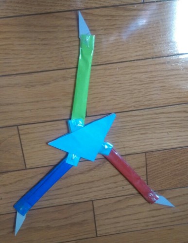 最近おこちゃまが折り紙に夢中手裏剣に剣にそして今回いきなりドラゴンクエストヒーローズに出てくるジュリエッタその主要武器である武器 ブーメランを作れとタブレットで作り方の画面を探して…その通りは面倒なので簡易的に作りました。先と中心は厚紙で壊れにくくあと動かないと納得しないようで爪楊枝を間接ごとに刺してこんな感じにできました。まどかちゃんに持たせてみた感じがこれ…先を曲げたりしたらこんな感じに…幼稚園児の僕ちゃんは喜んで遊んでいるのでまぁ良いのかなと折り紙で自分でいろいろ何かしら作ろうとするのは良い傾向だよね…なのでありますよ
