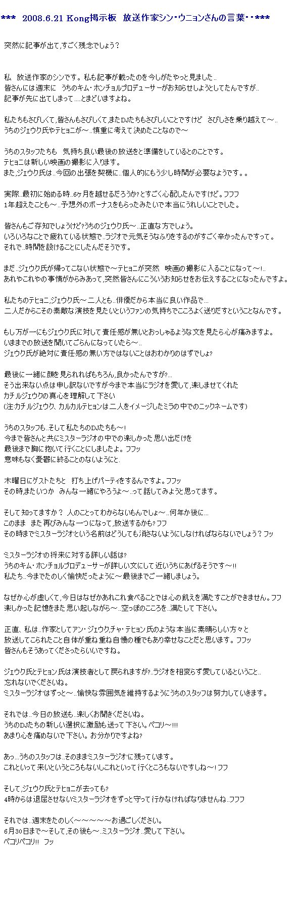 WookieNetさんに記事が出てました。ほんとに寂しくて寂しくて仕方ありませんが、ミラでオッパとテヒョンくんに1年2ヶ月本当に楽しませてもらいましたそしてゲストのみなさんにも楽しませて頂きましたねオッパ、テヒョンくん、お疲れさまでしたあと残り1週間あります。テヒョンくんよろしくお願いします。オッパ・・・30日にでの出演待ってますねそして私個人的発言になりますが・・・オンニ~ひろみん☆オンニ~ミラ始まってからの1年2ヶ月お疲れさまでしたオンニには本当に感謝していますオンニのおかげで色々楽しませて頂きました。これからも色々お世話になるかと思いますが、よろしくお願いします