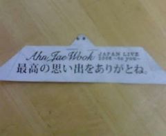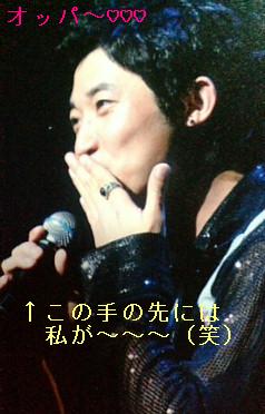 みなさんコンサ終わっていかがお過ごしでしょうか?毎回の事ですが、コンサ前はドキドキワクワクでどうしようもないけどこのコンサ終わった後の後遺症は中々治りませんよね~今回は特に重症?なのかちょっと大変です何日か前に仕事先で会った若い女の子に『韓流に嵌ってるんだぁ~』と話をしたらその子が『誰が好きなんですか~?』って言うから『あっ!!誰か好きな俳優いるの?』って逆に聞いたら『アン・ジェウクさん』と言ったんです~『じゃあコンサ行ったのぉ~~??』って聞いたらちょっと不思議な表情・・・俳優アン・ジェウクさんは知ってるけど、歌手アン・ジェウクさんを知らなかったらしいのですと、言う事で・・・歌手のオッパはサイコーだという事を教えて(←偉そうないい方)そしたら帰りがけに『CD買ってみようかな~?』っていうのでちょうど持って行ってたポータブルで聴いてもらったらその場で嵌ってくれました~そしてそのまま一緒にショップへ(どのがあるか分からないから一緒に行ってと言われたので)そしたら4集しか無かったけど購入してバイバイしました~その後が来て『嵌りました~』だって~~またオッパファンを増やしてしまいました微妙なファン心理でファンは多い方がいいけどあまり増やしたくない気も・・・↑なんてワガママなんだか・・・