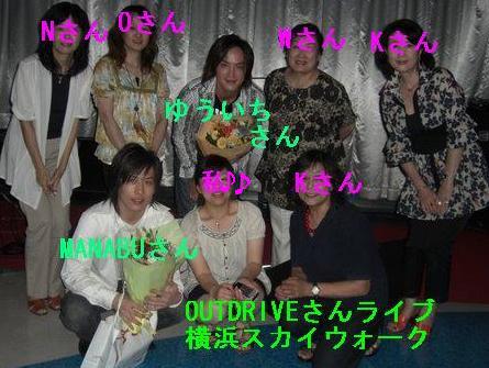 ある繋がりで知り合った方のお誘いで去年から何度かお邪魔しているライブがあります『OUTDRIVE』さんという2人組の方達です昨日は夜景もキレイな場所でのライブOUTDRIVEさん達も夜景見たり、こっち見たりと言っていましけど、夜景はライブが終わってからでも見れるって事でライブに集中ひゃ~MANABUさんが隣にYU-ICHIさん真上に私個人的に好きな曲が何曲かあります昨日も2ステージあって私達(6人)は2ステージ目の参加だったので1ステージ目に歌っていたら歌わないかなぁ~ライブも終わり・・・『あ~今日は聴けなかった』と思っていたらみんなからの『アンコール』に応えてくれて1曲!やった~~~私の1番好きな曲~~歌って頂けました昨日のライブです OUT DRIVEさん、SHINさんお疲れさまでした名前入りもありがとうございましたMさんいつもお世話様です。お声かけて頂きありがとうございますライブ参加したみなさんありがとうございましたそしてでお世話になったNさん、一緒に行ったOさん、Kさん(Jママ)、Wさん、Kさんお世話になりましたちょっと焦った終電には余裕がありましたお騒がせしました