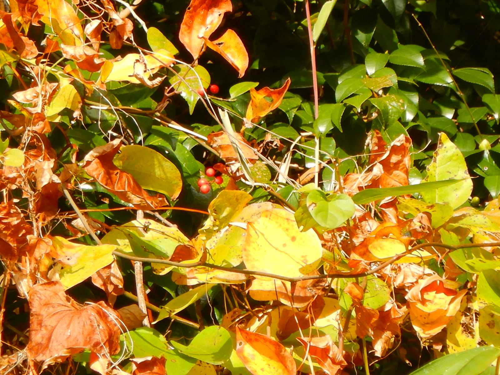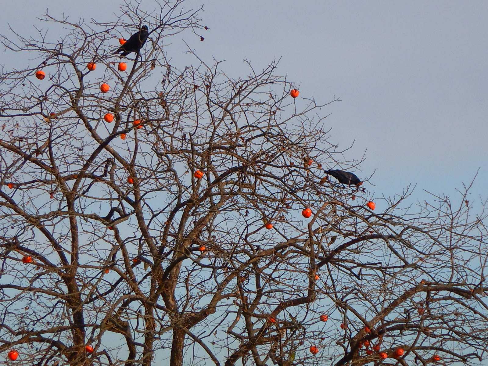 柿をついばんでいる2羽のカラス、冬に向かってエサはだんだん少なくなっていきます。